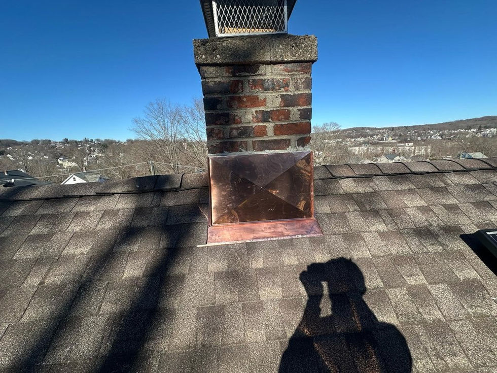 A collection of images showcasing various roofing projects including flat rooftops, shingled roofs, and chimney installations.